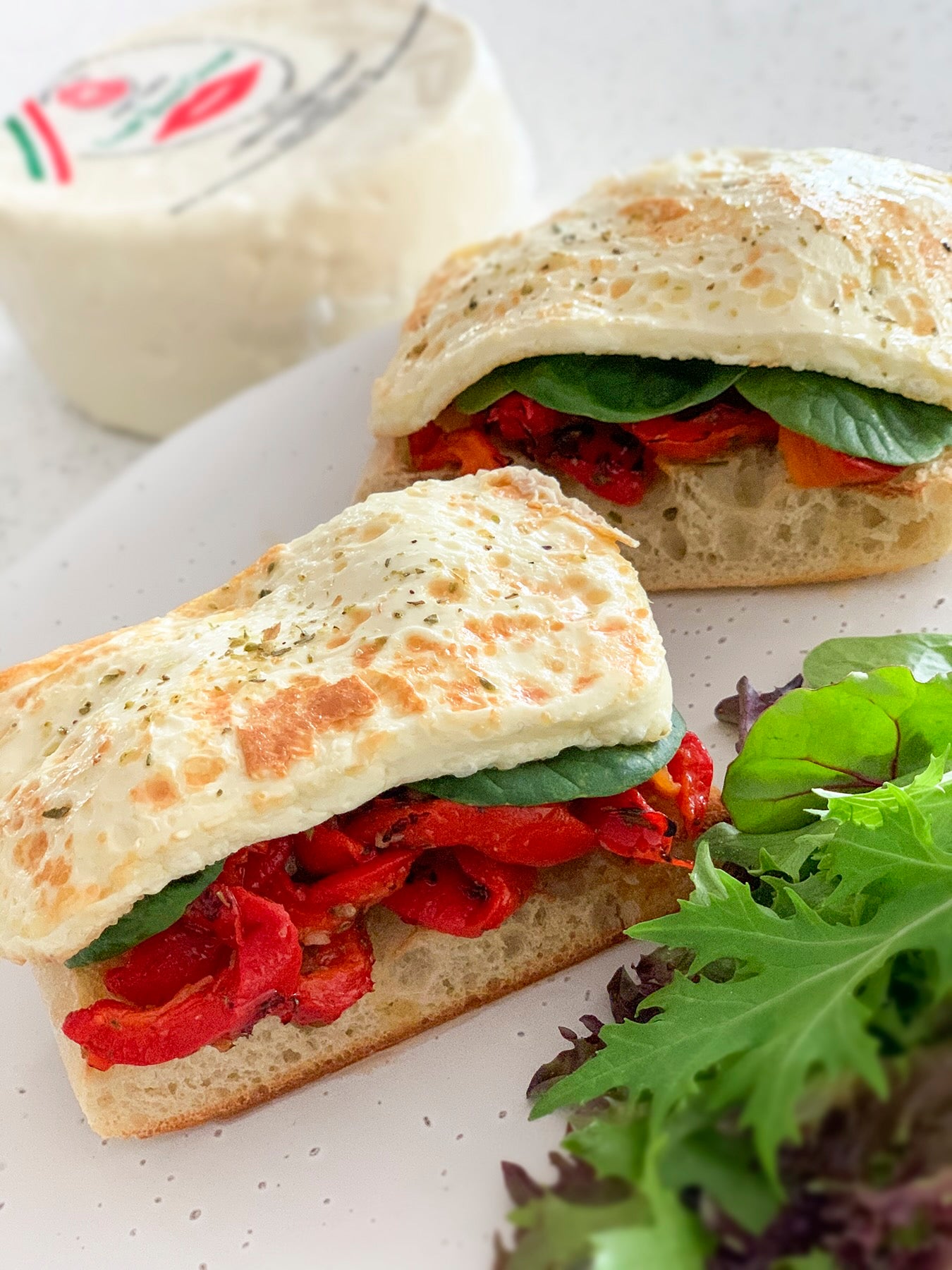 This ciabatta sandwich draws inspiration from the classic Italian tradition of combining fresh, high-quality cheeses with simple, vibrant vegetables. Bacio cheese, a soft, creamy Italian variety, is pan-fried to bring out its delicate flavour and golden texture, while roasted capsicum adds sweetness and spinach contributes freshness. Easy to assemble and packed with flavour, this sandwich is perfect for casual lunches, light dinners, or a gourmet snack at gatherings — celebrating the simplicity and richness of authentic Italian ingredients.