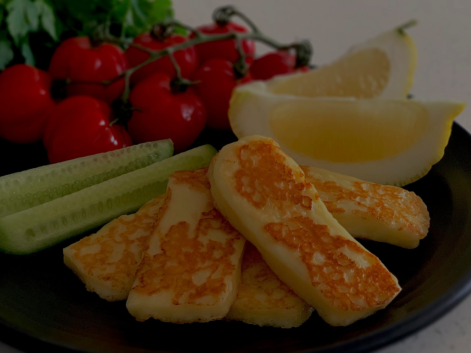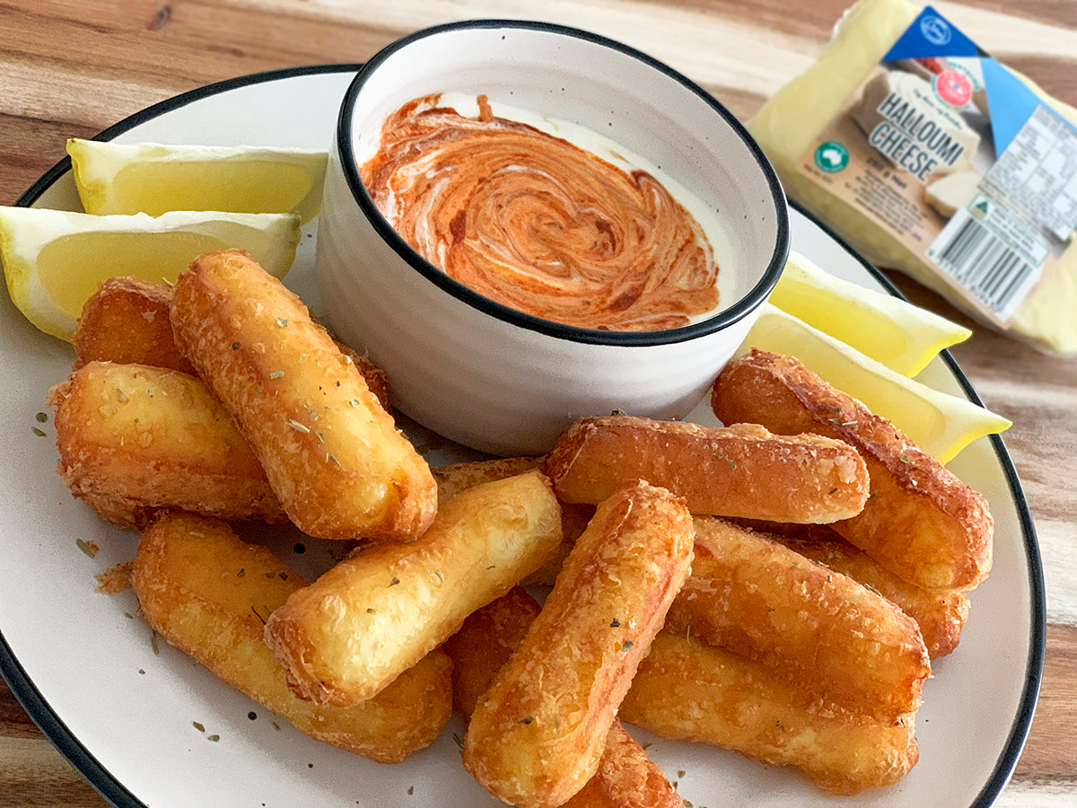 Prepare the halloumi: Slice halloumi into thick fries, then lightly coat in flour.