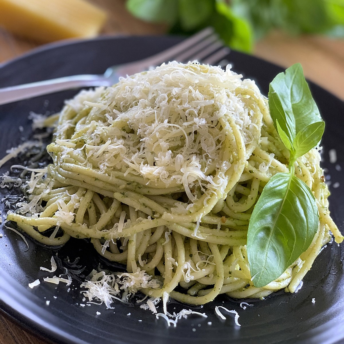 Toss spaghetti with pesto, adding pasta water to loosen. Garnish with extra Parmigiano and fresh basil